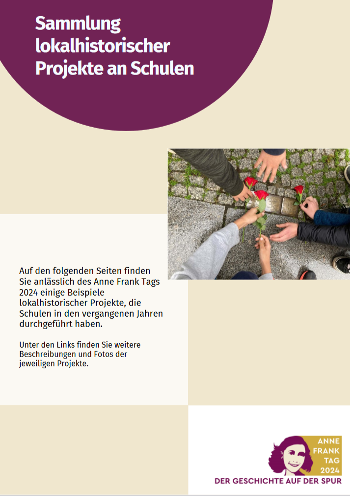 Die Sammlung bietet anlässlich des Anne Frank Tags 2024 einige beispielhafte lokalhistorische Projekte, die Schulen auf dem gesamten Bundesgebiet in den vergangenen Jahren durchgeführt haben. In der Broschüre finden Sie Links zu ausführlicheren Informationen und Fotos der jeweiligen Projekte.