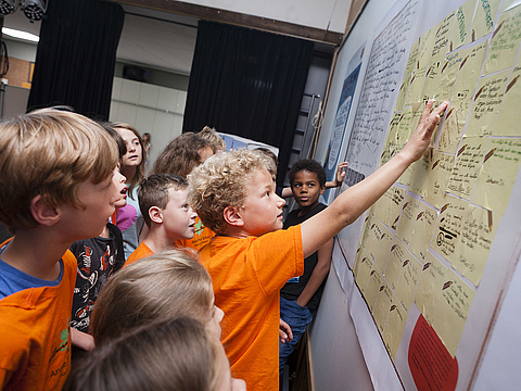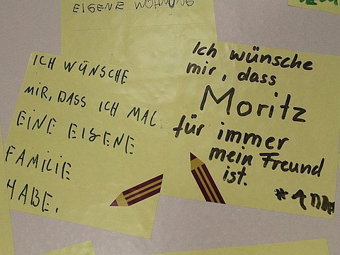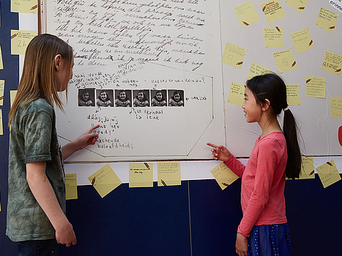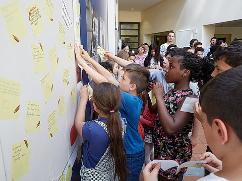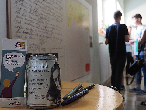 Zum Aktionstag verschickte das Anne Frank Zentrum an alle teilnehmenden Schulen kostenfrei Materialien: Großformatige selbsthaftende Wandfolien ergaben eine Ausstellung über Anne Frank, ihr Tagebuch und ihr Leben. Dazu gab es Aufkleber, die im Unterricht oder am Aktionstag von den Schüler*innen beschriftet wurden. Ihre Gedanken hefteten sie dann an eine großformatige Nachbildung von Anne Franks Tagebuch. Die Schüler*innen antworteten auf folgende drei Fragen: