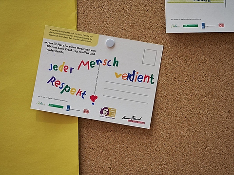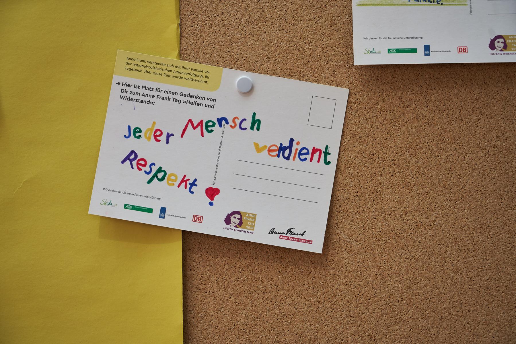 Das Anne Frank Zentrum schickte zum Anne Frank Tag an alle teilnehmenden Schulen kostenfrei Materialien. Dazu gehörte eine großformatige Plakatausstellung, die 16-seitige Anne Frank Zeitung samt pädagogischem Leitfaden für Lehrkräfte und von den Schüler*innen gestaltbare Postkarten. Zum Aktionstag ermutigte das Anne Frank Zentrum die teilnehmenden Schulen darüber hinaus, eigene kreative Aktionen mit den Schüler*innen umzusetzen. In zahlreichen Orten und Städten in Deutschland zeigten Kinder und Jugendliche so ihren Einsatz für eine demokratische Gesellschaft.