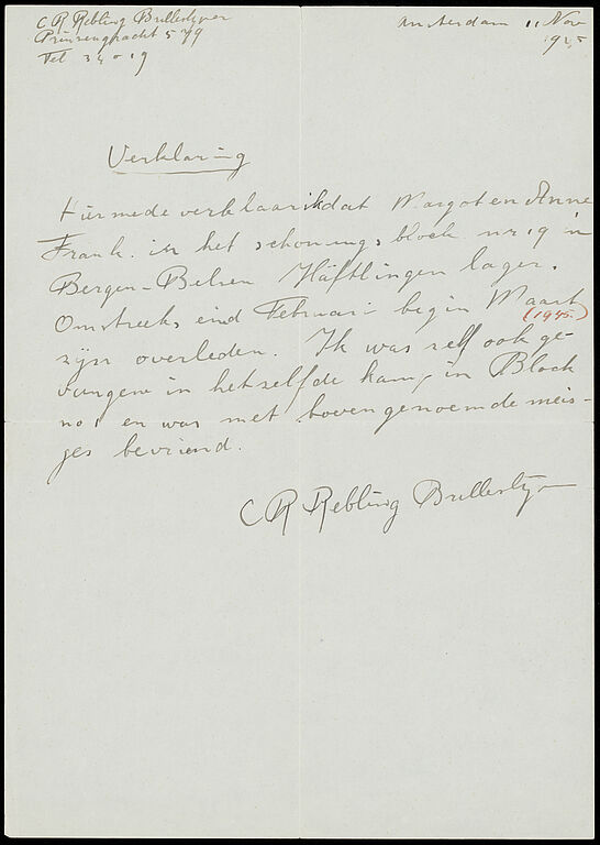 Lin wird Zeugin von Annes und Margots Tod im Frühjahr 1945. Wenig später befreien britische Soldaten Bergen-Belsen. Von Lins Familie überleben nur sie und ihre Schwester Janny den Holocaust.