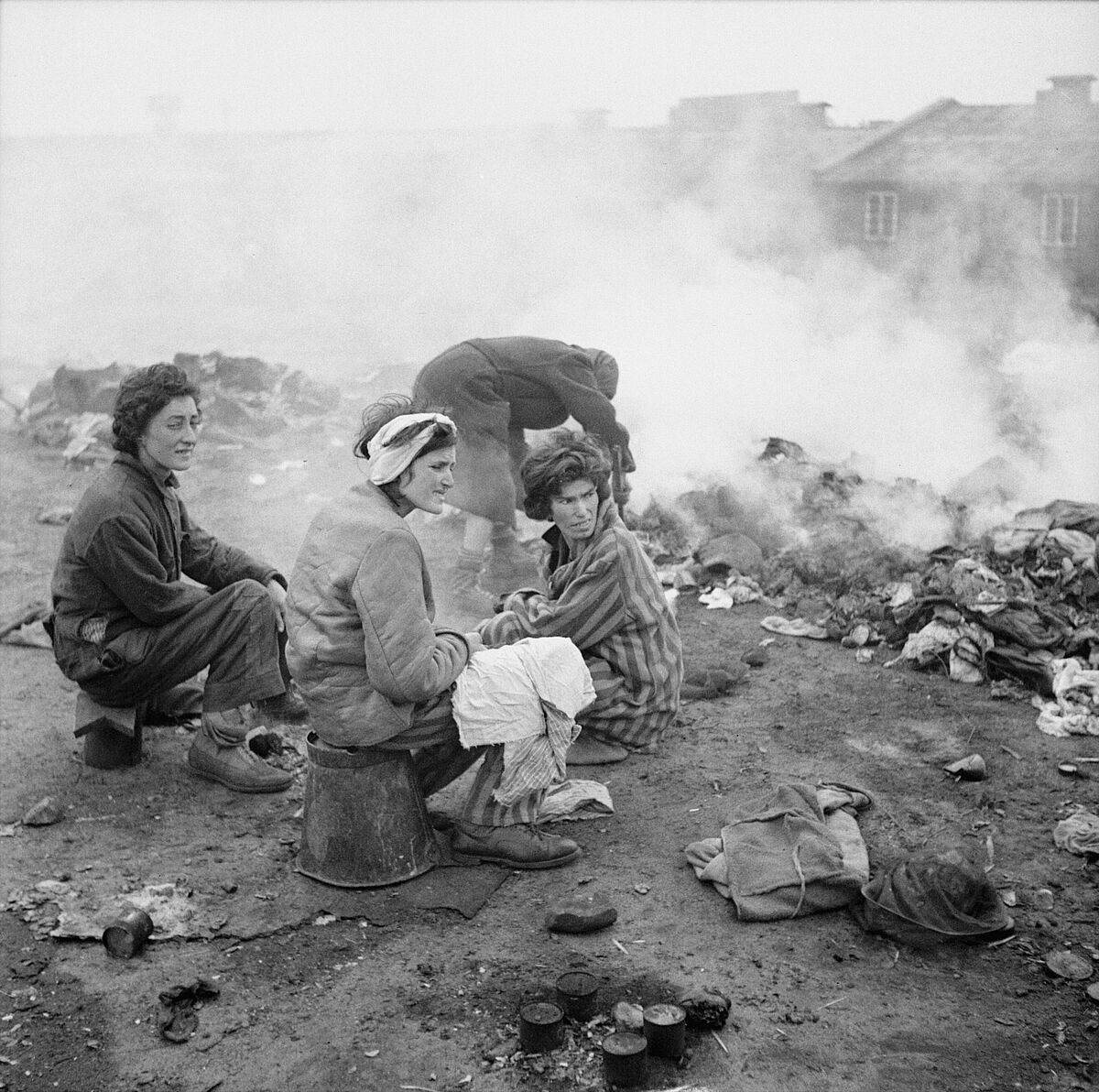 B) Ein Foto zeigt eine Szene in Bergen- Belsen kurz nach der Befreiung. Was kannst du auf dem Bild erkennen?